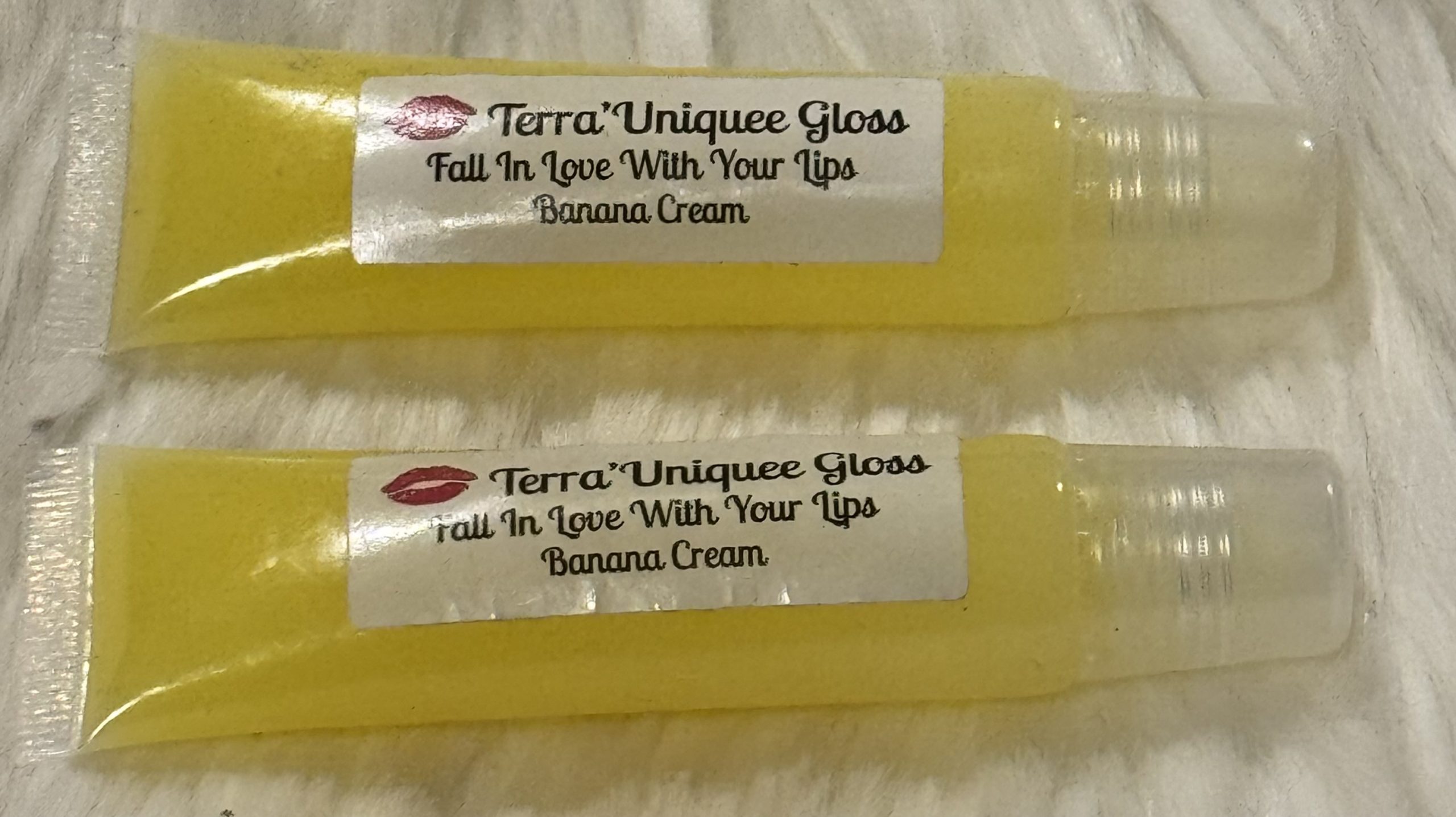 Clear scented banana scented gloss made with versagel infused with coconut oil, vitamin E oil, joboja oil, grapeseed oil,banana flavoring and yellow pigment.
