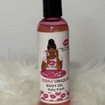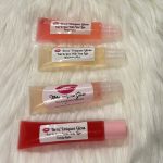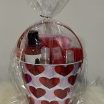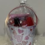 This pail contains 5 different flavors of lip gloss Watermelon,pink bubblegum,candy apple,strawberry kiwi ,and mixed berry it also comes with a pink Terra’uniquee gloss satin edge scarf,a red heart shaped keychain and a choice between a Baby fresh or coconut body oil.
